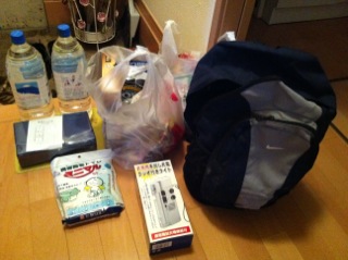 苦労しながら、手に入れた防災グッズを玄関に置いておきました。