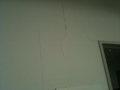 その後、帰宅するにも電車が全部止まっており、帰宅難民となった人たちは会社で一泊したのでした。当社ナビットの入り口にも、ひびがみつかりました!