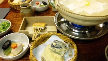 このコース料理は湯豆腐がメインにてんぷらや付き出しなど多数のサイドディッシュがあり、