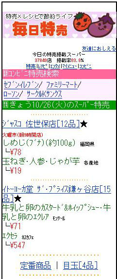 本日10/27(水)より、36,921店舗分の「コンビニ特売」の掲載を、「毎日特売」PC版・携帯版両方で開始いたしました。