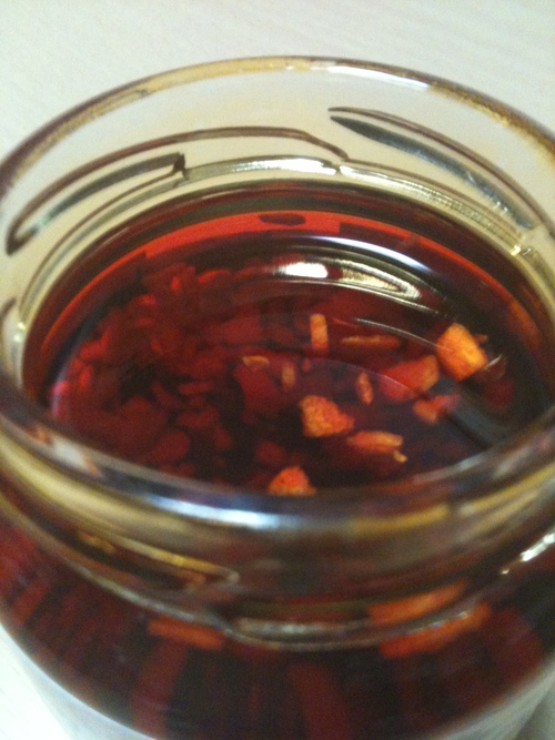 エスビーといえばカレー等、スパイスの名門企業。これはうまいのではないか?と期待して、帰宅後我慢出来ずに封を開けると、そこには澄んだ美しい赤い油。これはみるからに美味しそうな感じがします。