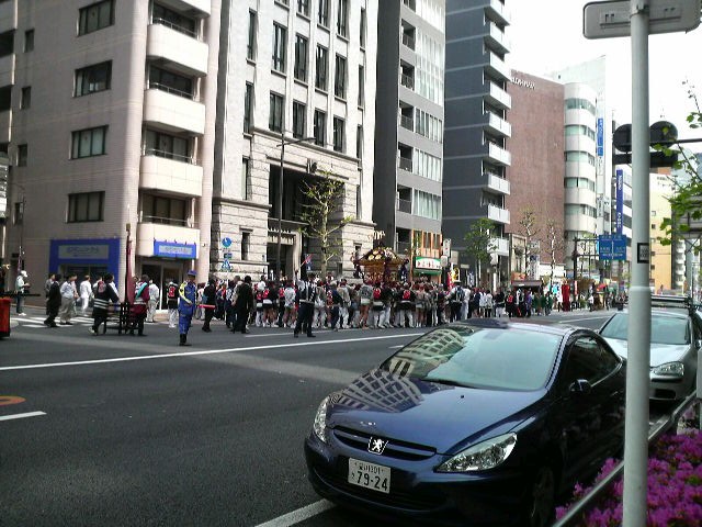 いつも、車でごった返しているこの交差点をみこしが突っ切るのはなんだか