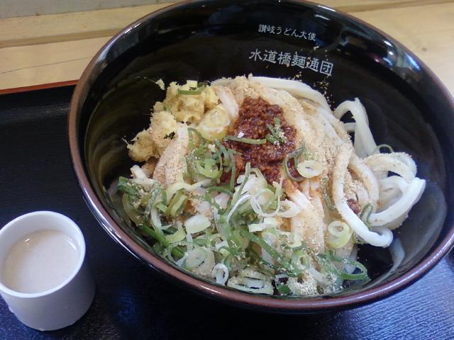 セルフ形式の店内で、季節限定の冷たいうどん「ゴマだれ坦々うどん」を注文。