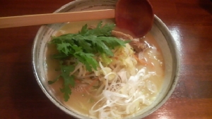 トッピングはもやしと春菊などなど沢山入っていて、このあっさりスープと