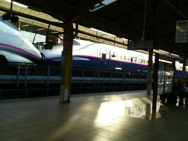 東京駅。冬至過ぎの短い午後、西日が美しく差し込み、新幹線を美しく照らし、手前の東海道線のホームに反射しています。あまりにもきれいで、つい写真を撮ってしまいました。