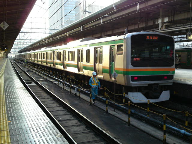 その反射した光は、その隣の東海道線ホームに停まっていた電車にも輝きを与えています。