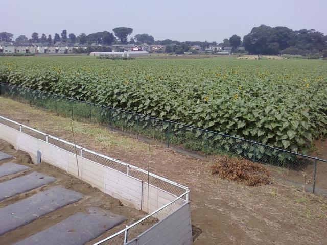 広々とした畑にかすかに見えるひまわりの花は、けっこう淋しいものがあります。