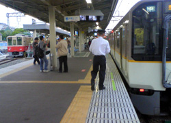 写真は阪神の御影駅。この駅は、そんな曲線の上に立つ駅なんですが、近鉄の大型電車がゆっくり走っていく光景を見て、感動。この乗り入れは、ここまでこぎつけるには大変だったろうなあ、でも素晴らしいことだ、って思いました。