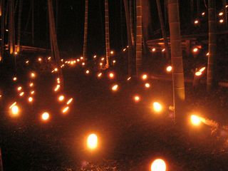 城跡ということで、地形が小高い丘なのですが、その多くが竹薮になっています。その竹薮の斜面に、竹を輪切りにしたもののなかに水を入れ、浮かばせたロウソクに火を灯したものが無数に置いてあります。場所がら、周りに電気の照明がないため、炎のやわらかい光を感じることができます。