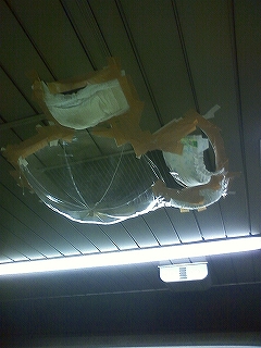 よほど雨漏りしたのでしょうか、ビニール傘を逆向きにして雨もりを受けています