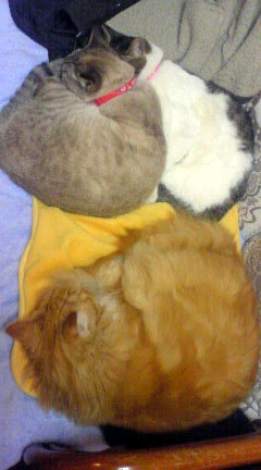 で、まあ、なかなか5匹があつまることってないのですが、そのうちソファ上で寝る3匹までを同じフレームに収めることに成功…(^^