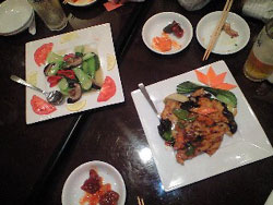 お通し?の前菜のあとは炒め物、唐揚げ、酢豚、ゴマ団子、春巻き、チャーハン、タマゴスープ、ラーメンなどがお皿に載りきらないほどの勢いでどんどん出て来るのでした!