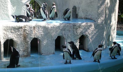 上野動物園にはペンギンポイントが二箇所あって、いっこは丸い島の周りを流れるプールが囲んでます。