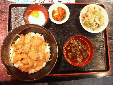 もりちゃん丼は、ポークカルビともやしの丼に、ねぎスープ、キムチ、温玉、サラダ付。