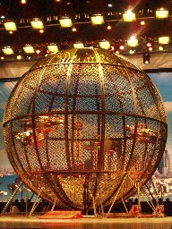 地球儀みたいな球体の中を、オートバイが最大5台で入って、クルクル回るんだ!