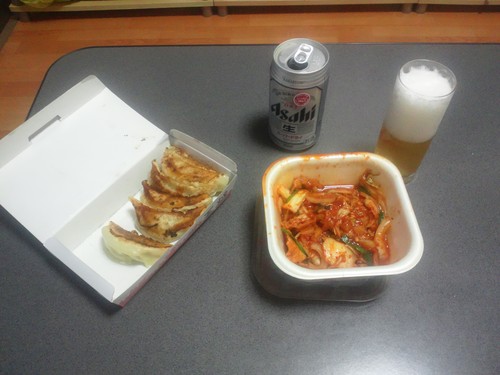 リモコンいじくりながらビールを飲み、餃子と豚キムチを食べました。