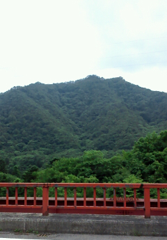 土手の上で眼前に迫る青々とした山を見つめて立ちつくす一羽のカモ。