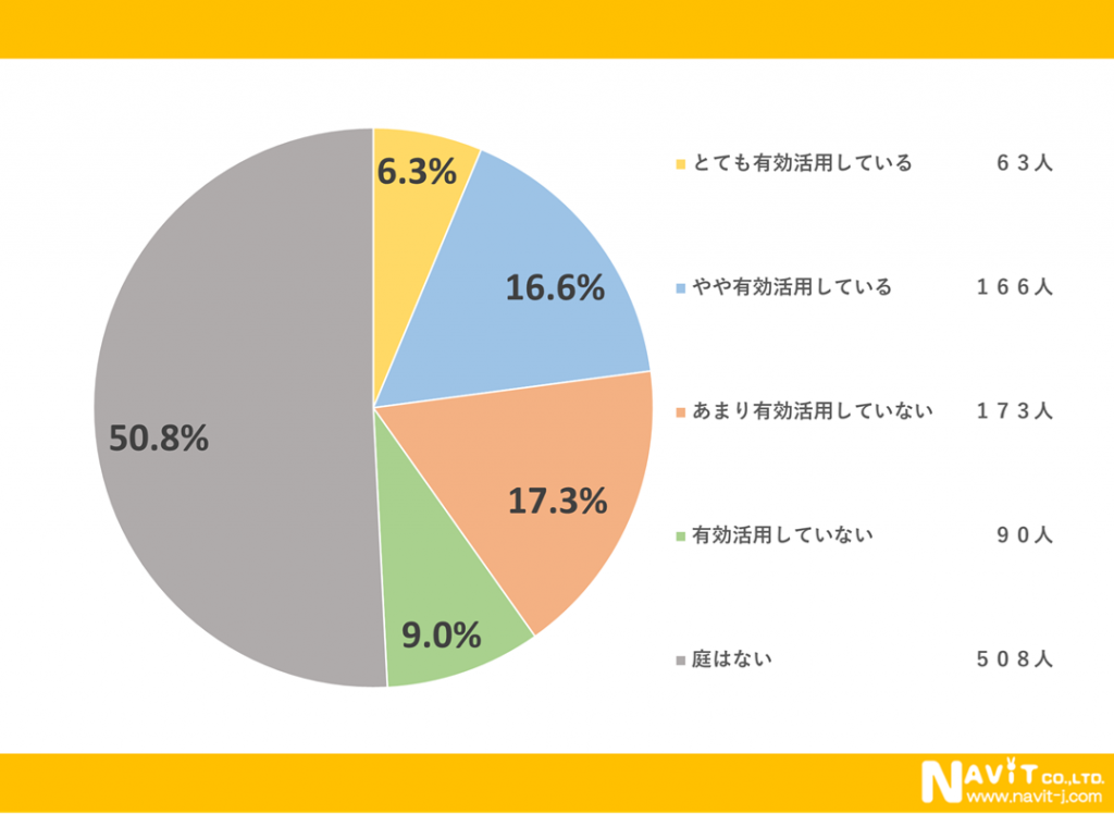 庭の活用レベルについてのアンケートでは「やや有効活用している」と解答した人が16.6%で「とても有効活用している」と解答された人は6.3%に留まりました。
