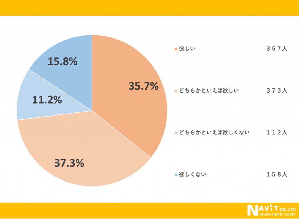 家を建てる際に庭が欲しいかたずねたアンケートです。庭が「どちらかといえば欲しい」と解答された人が1番多く37.3%でした。「欲しい」と回答された人は35.7%だったので、合計すると70%以上の人が庭が欲しいという回答となっています。
