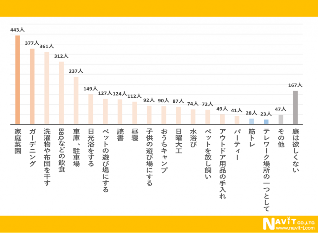 庭でどんなことをしてみたいか。また、どんなことをしているのかというアンケートを複数回答でいただいた結果で1番多かったのが「家庭菜園」で443人でした。次に多かったのは「ガーデニング」で377人で3番目が「洗濯物や布団を干す」で361人という結果になりました。