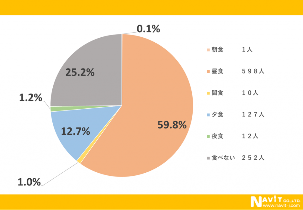 つけ麺を食べる時間帯についてたずねたアンケートで1番多かったのは「昼食」で59.8%と6割近くの人がお昼に食べるという結果が出ました。次に多かったのは「夕食」で12.7%、「夜食」がぐっと下がって1.2%という結果でした。