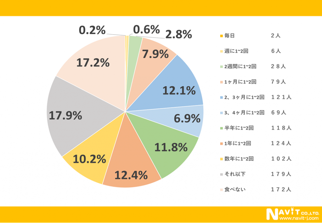 つけ麺を食べる頻度に関するアンケートです。1番多かったのが「1年に1〜2回」で12.4%でした。次に多かったのが「2、3ヶ月に1〜2回」で12.1%、3番目に「半年に1〜2回」が11.8%と続いています。