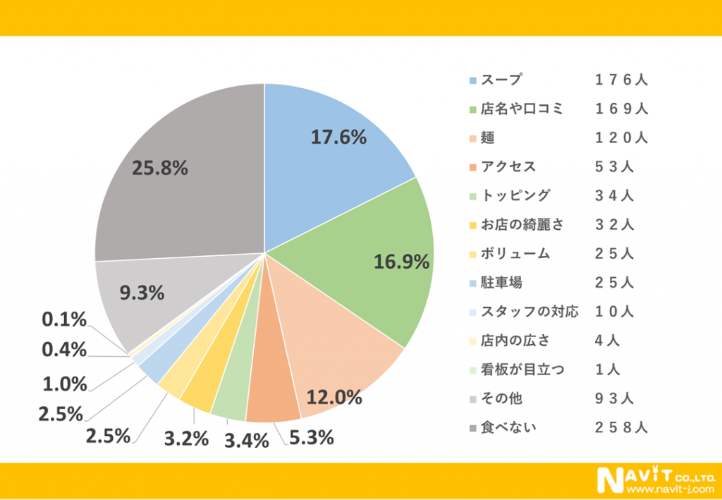 つけ麺店を選ぶ基準では「スープ」を基準に選ぶ人が1番多く17.6%でした。次に多かったのが「店名や口コミ」で16.9%で、その後に「麺」が12.0%という結果になりました。