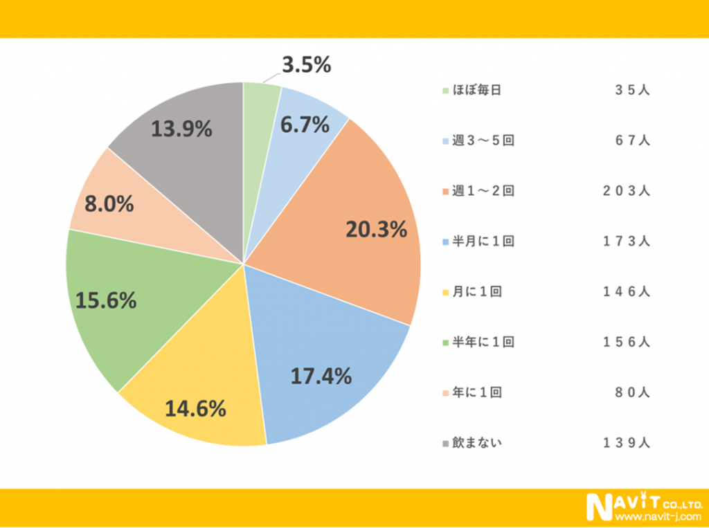 即席味噌汁を飲む頻度についてのアンケートです。1番多かったのは「週に1〜2回」で20.3%で「半月に1回」で17.3%でした。「ほぼ毎日」という人も3.5%程度いらっしゃいました。