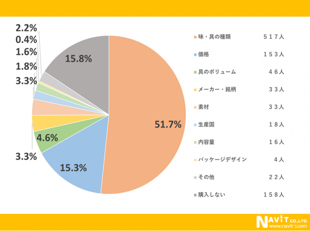 即席味噌汁を購入する基準についてのアンケートでは、「味・具の種類」という人が1番多く51.7%と半数以上でした。次に多かったのが「価格」が15.3%という結果になりました。