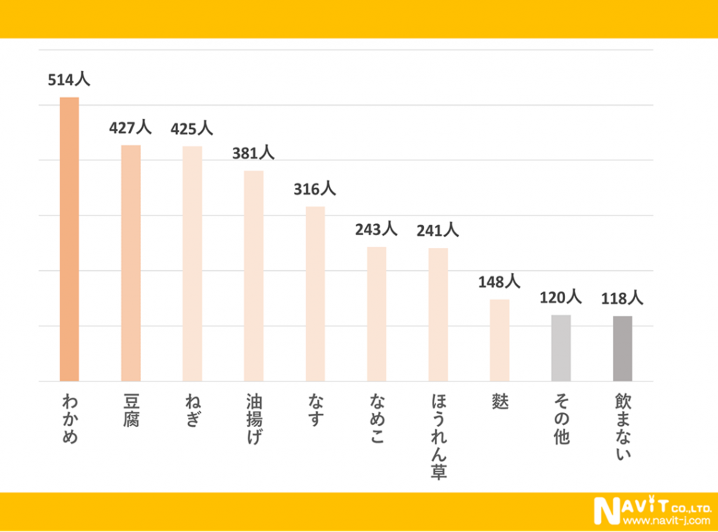 このアンケートは複数回答でいただきました。味噌汁の好きな具はなんですか?というアンケートに対して1番人気があったのでが「わかめ」で514人でした。次に多かったのが「豆腐」で425人、僅差で「ねぎ」が425人という結果になりました。