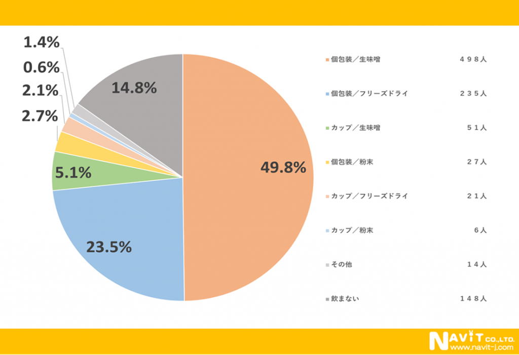 よく飲む即席味噌汁のタイプについてたずねたアンケートで1番多かったのは「個包装/生味噌」で49.8%と、ほぼ半数の人が選びました。次が「個包装/フリーズドライ」で23.5%という結果になりました。
