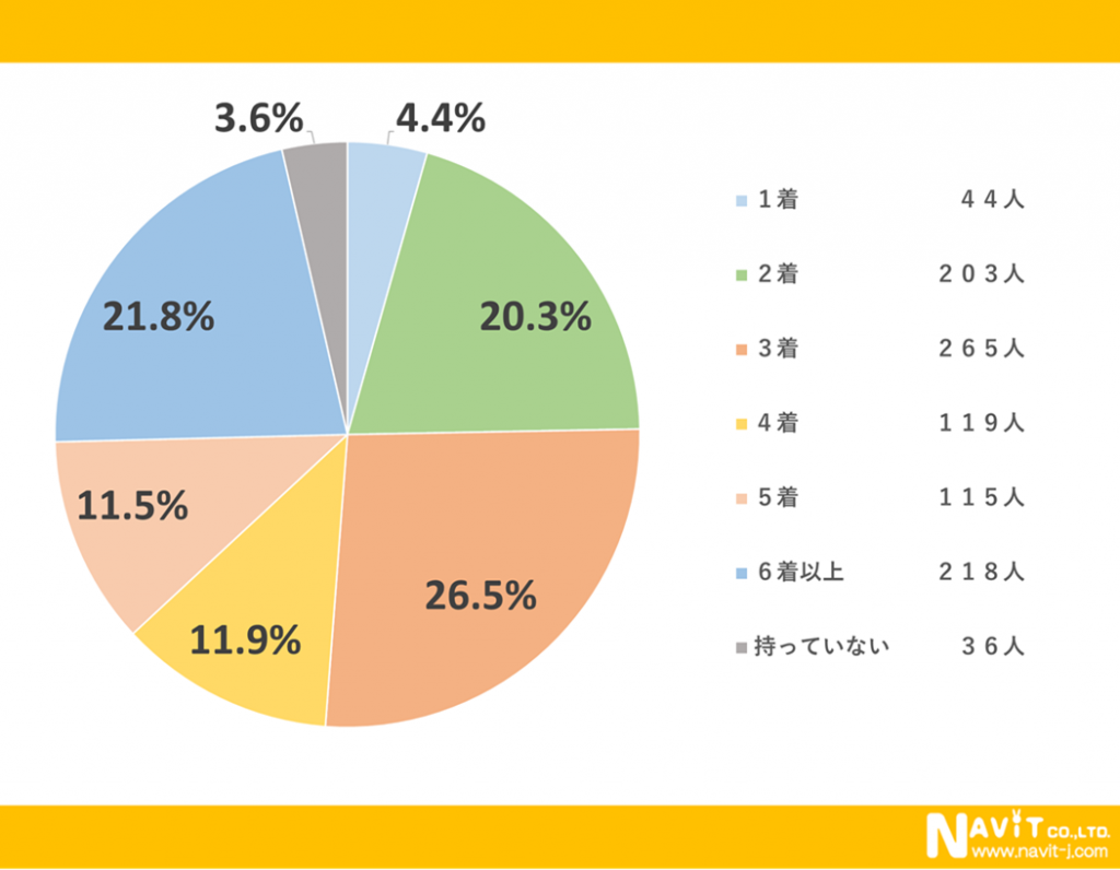 冬物アウターを何着持っているかというアンケートで1番多かった回答が「3着」で26.5%で次に多かったのが「6着以上」で21.8%でした。3番目が僅差で「2着」の20.3%という結果になりました。