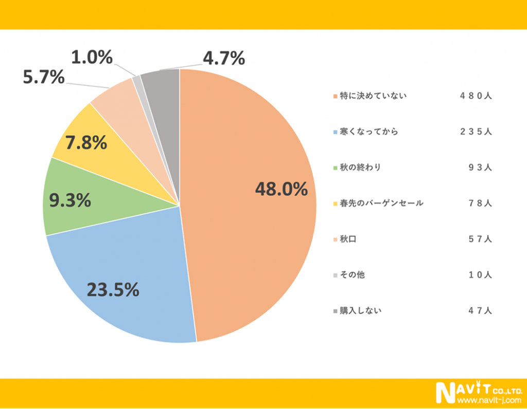 冬物アウターをいつ買うのかというアンケートでは「特に決めていない」という人が1番多く48.0%という結果になりました。次に「寒くなってから」という人が23.5%で、「秋の終わり」という人が9.3%という結果になりました。