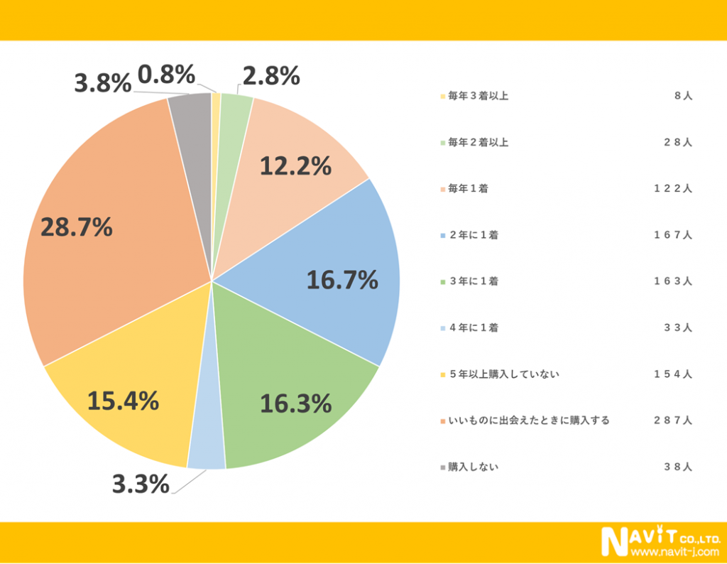 冬物アウターを買う頻度についてのアンケートでは「いいものに出会えた時に購入する」という人が1番多く28.7%、次に「2年に1着」という人が16.7%で「3年に1着」という人が16.3%という結果になりました。