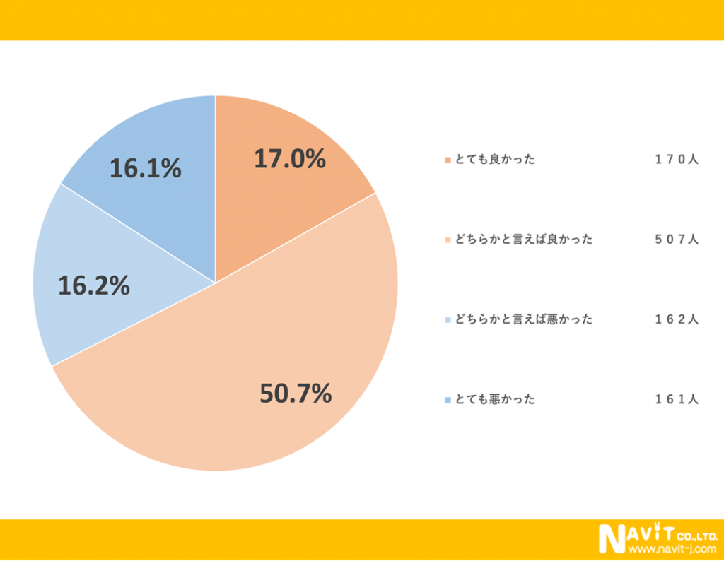 成人式に参加して良かったかどうかのアンケートの結果では「どちらかと言えば良かった」と回答された人が1番多く50.7%でした。また「とても良かった」と回答された人が17.0%で合計すると7割近くの人が成人式に参加して良かったと回答しています。