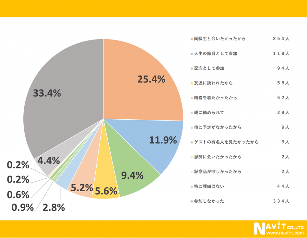 成人式参加の理由をたずねたアンケートで1番多かった回答は「同級生と会いたかったから」が25.4%でした。次に多かったのは「人生の節目として参加」が11.9%で「記念として参加」が9.4%と続いています。