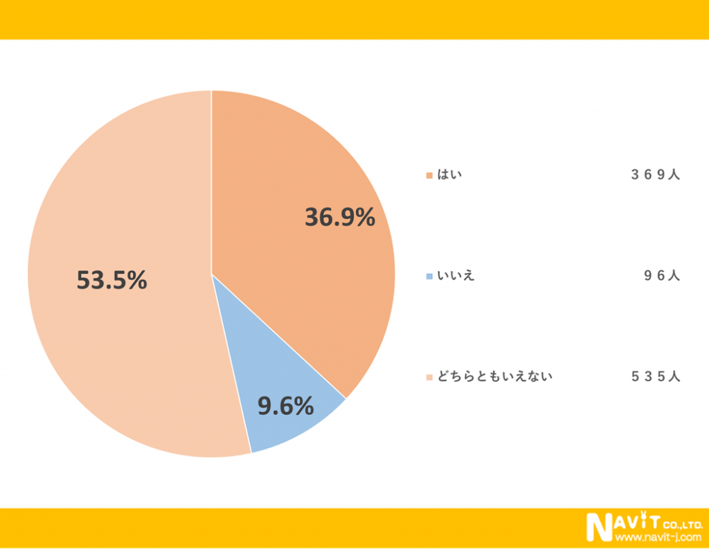 成人式で着物を着る風習に関するアンケートです。この風習を残したいですか?という質問に対して「はい」と回答された人が36.9%でした。また「どちらともいえない」と回答された人が53.5%という結果になりました。
