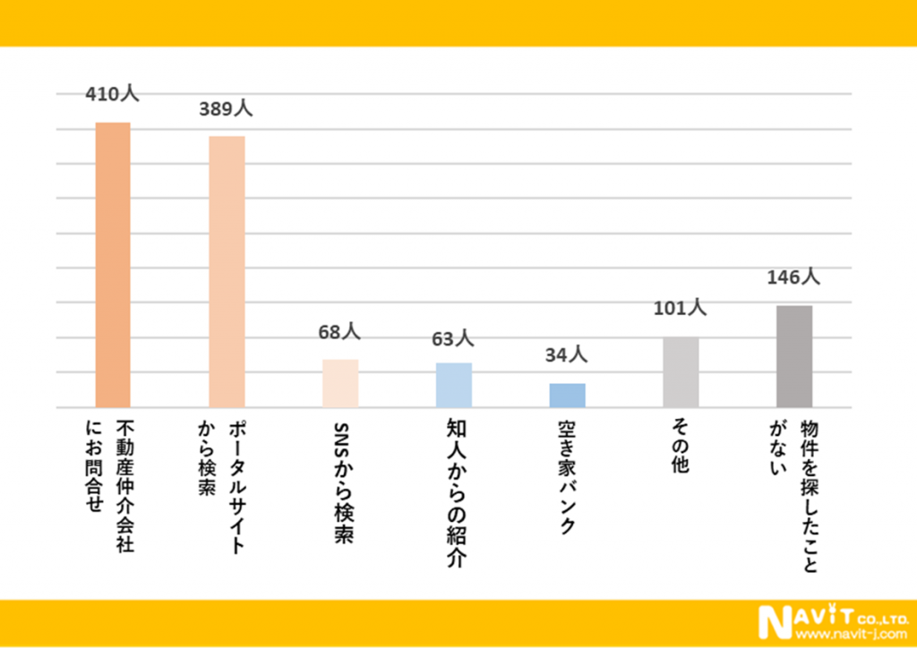 こちらは複数回答でのアンケートです。物件探しの手段についてのアンケートでは、「不動産仲介会社にお問合せ」が最多で430人、次が「ポータルサイトから検索」が389人、その次が「SNSから検索」で68人と続く結果となりました。