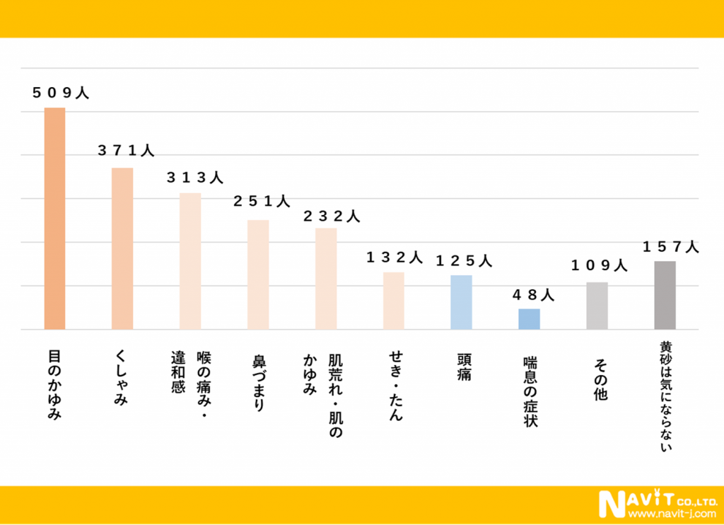 黄砂によって受けた健康被害について複数回答可で質問したところ、「目のかゆみ」と答えた人が509人と対象者の半数を上回りました。回答数に対する割合は22.7%でした。次いで「くしゃみ」(371人)、「のどの痛み・違和感」(313人)、「鼻づまり」(251人)、「肌荒れ・肌のかゆみ」(223人)、「せき・たん」(132人)などと、被害の内容は多岐にわたっています。