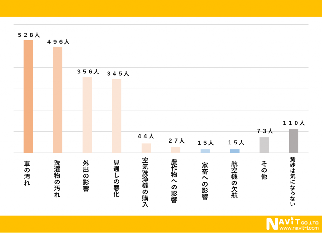 前問同様に複数回答可で生活への影響を質問しました。「車の汚れ」が最も多くて対象者の半数を超える528人。「洗濯物の汚れ」(496人)を合わせると、回答数の半数を超えています。