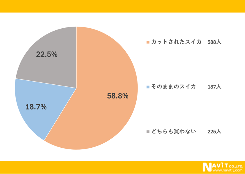 スイカを買う時の形についてのアンケートです。「カットされたスイカ」を買うという人が一番多く58.8%と半分以上という結果になりました。次に多かったのが「そのままのスイカ」で18.7%でした。