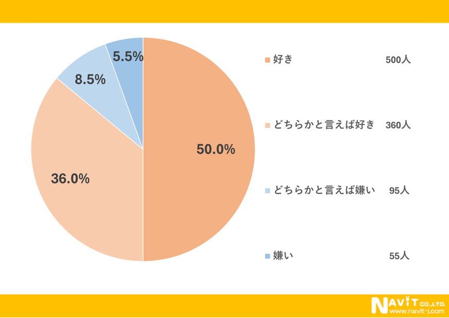 スイカは好きですか?というアンケートに対して「好き」が50.0%、「どちらかと言えば好き」が36.0%で、合計86.0%の人がスイカに対して好意的な印象を持っていることがわかりました。