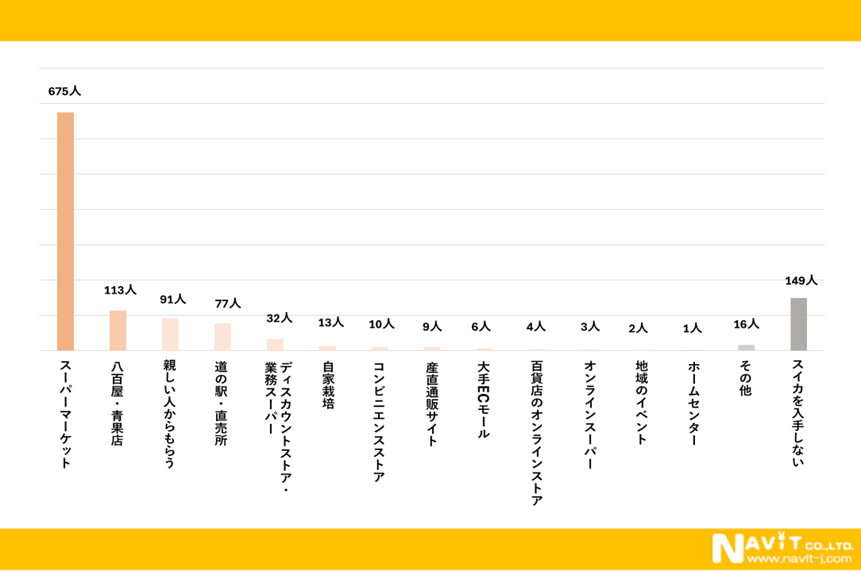 スイカをどこで入手するかというアンケートを複数回答にていただきました。一番多かったのが「スーパーマーケット」で675人でした。次に多かったのが「八百屋・青果店」で113人でした。