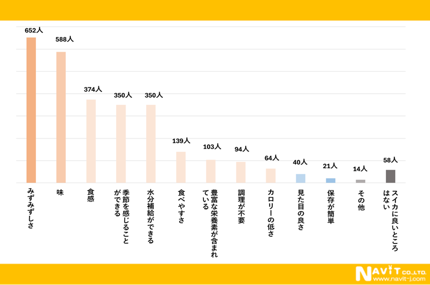 スイカの良さに関するアンケートです。こちらも複数回答でいただきました。「みずみずしさ」と回答された人が652人で一番多く、次に多かったのが「味」で588人、「食感」が374人と続いています。