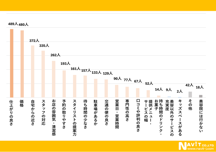 美容院を選ぶ基準についてのアンケートを複数回答にていただきました。1番多かったのは「仕上がりの良さ」で489人、次に「価格」で480人、3番目に「自宅からの近さ」で372人と続きました。