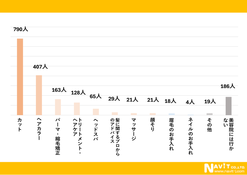 美容院に行く目的についてのアンケートです。こちらも複数回答となっています。美容室に行く一番の目的は「カット」で780人と圧倒的となっています。次が「ヘアカラー」で407人、3番目に多かったのが「パーマ・縮毛矯正」で163人という結果になりました。