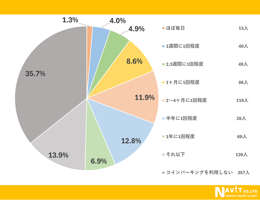 コインパーキングを利用する頻度についてのアンケートでは「2〜4ヶ月に1回程度」と回答された人が1番多く11.9%でした。次に多かったのは「1ヶ月に1回程度」で8.5%という結果になりました。