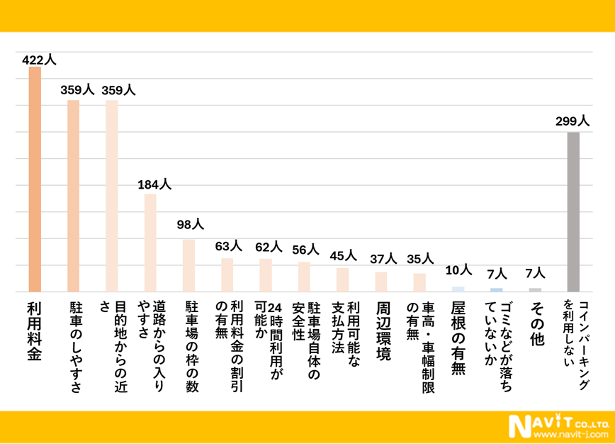 こちらのアンケートは複数回答にていただきました。コインパーキングで1番多かったのは「利用料金」で422人、次は「駐車のしやすさ」と「目的地からの近さ」が同人数で359人という結果でした。
