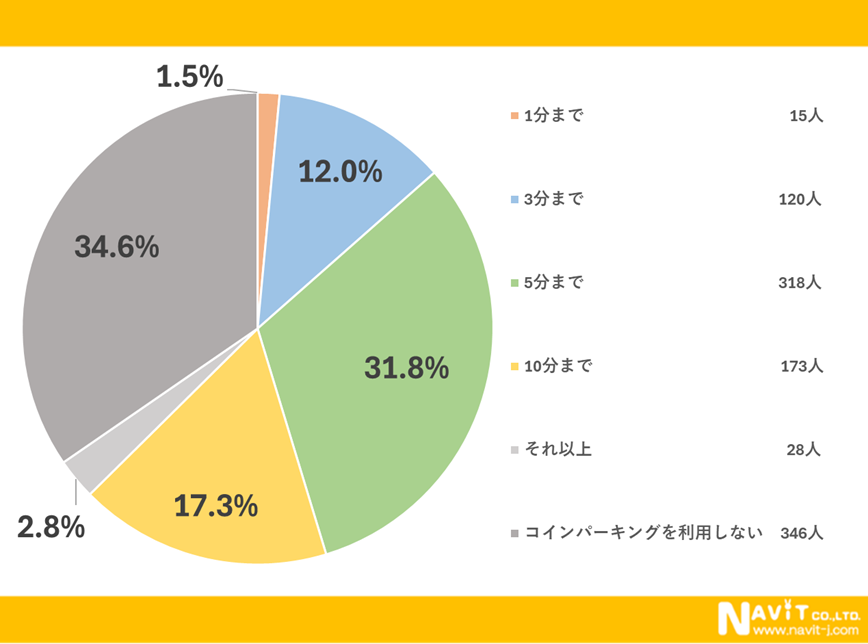 コインパーキングから目的地までの許容できる距離についてのアンケートでは、「5分まで」が1番多く31.8%という結果になりました。次に多かったのが「10分まで」で17.3%、「3分まで」が12.0%と続いています。