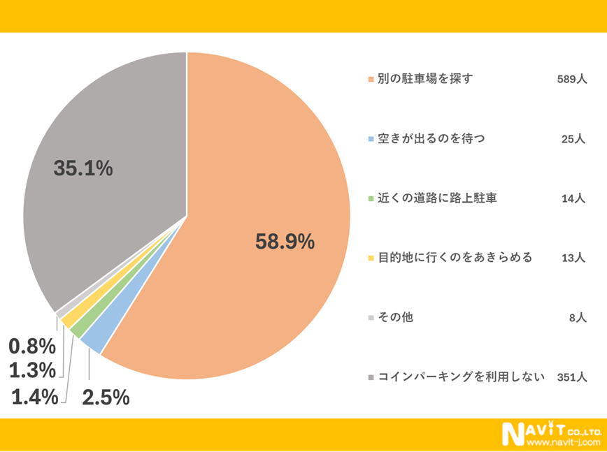 目的のコインパーキングが満車の場合の対応についてのアンケートです。1番多かったのは「別の駐車場を探す」で58.9%、次に多かったのは「空きが出るのを待つ」で2.5%という結果になりました。